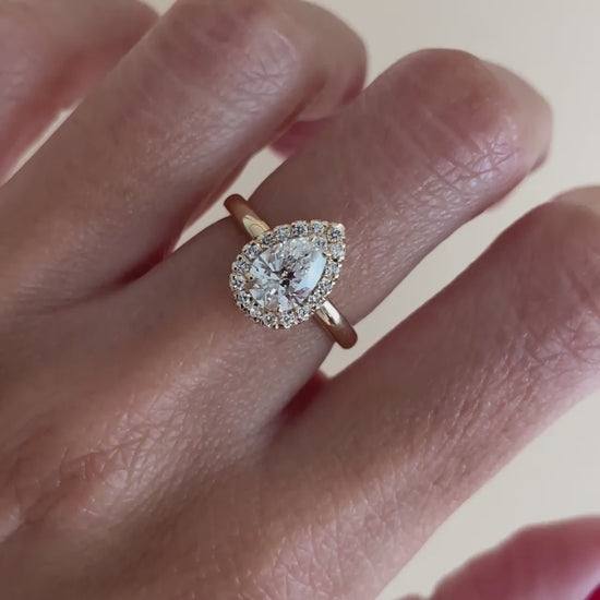 The Princess Pear Ring features a delicate pavé halo surrounding a 3.08 carat IGI-certified lab-grown center diamond, creating a captivating and radiant brilliance.